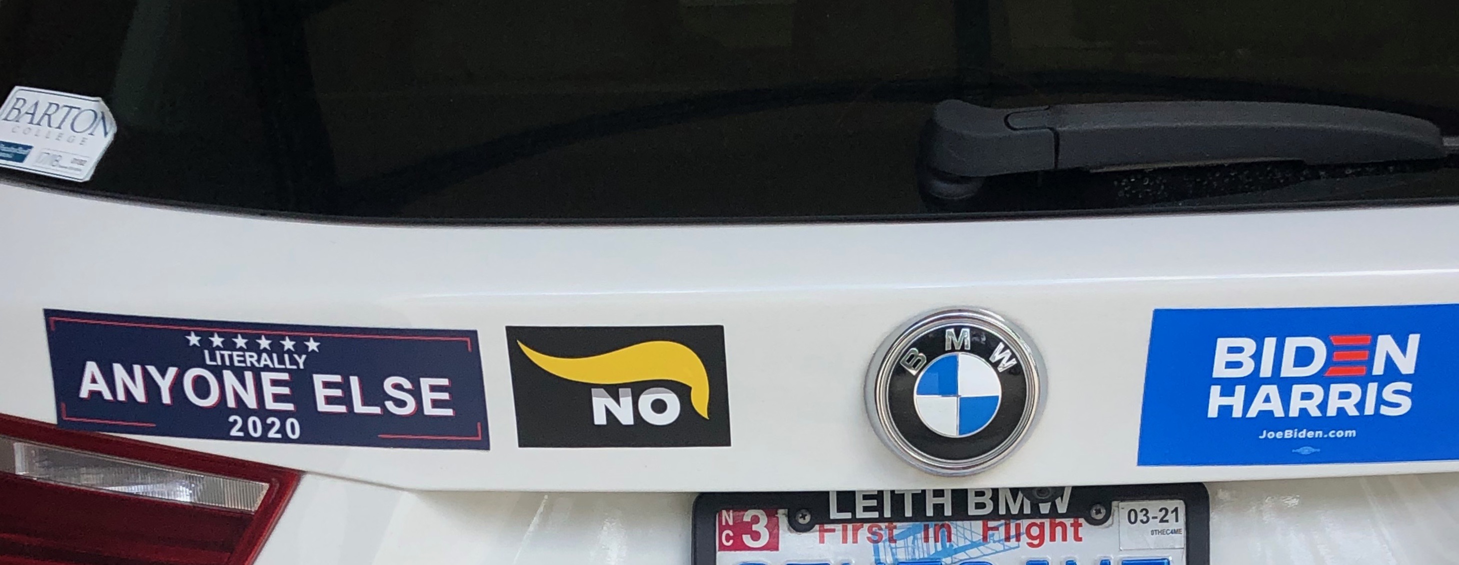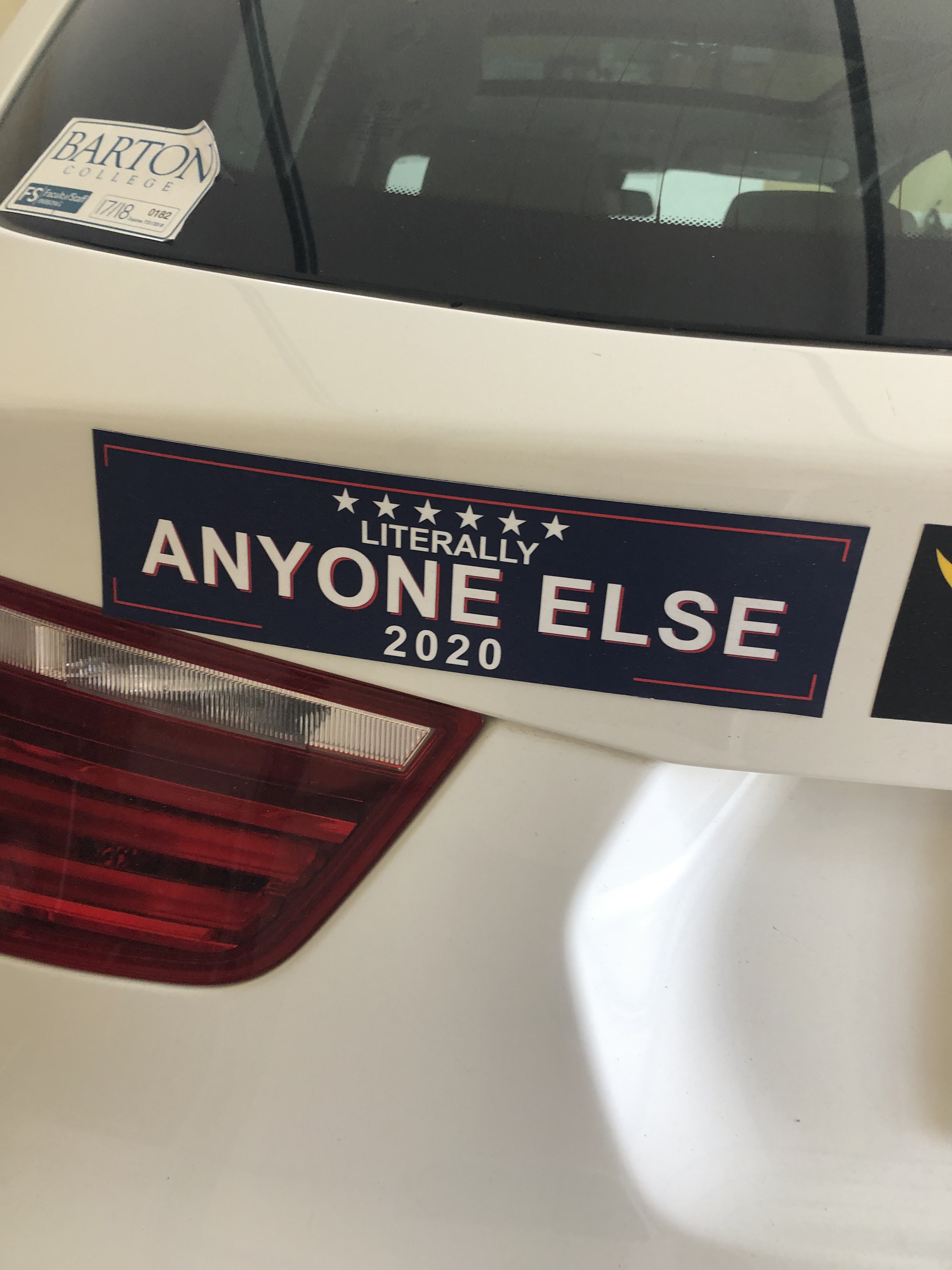 Just one look at my car as I am driving down this road to work definitely lets folks know how I feel about Donald Trump, and I guess, how much I do not fit in with my neighbors…One of my bumper stickers states, “Literally ANYONE ELSE 2020.” (I bought this one before we knew who was going to run against Trump in 2020, but it really did not matter who it was…literally anyone else would be an improvement.) Another has a picture of Trump’s hair with the word “No” in front of it. (This one is my favorite…subtle, yet witty) To say that Donald Trump’s presidency has changed my life is an understatement. Since the shocking (and somewhat questionable) results of the 2016 election, Trump has impacted my relationships and my political engagement in ways I never would have imagined when I voted against him in November of 2016.